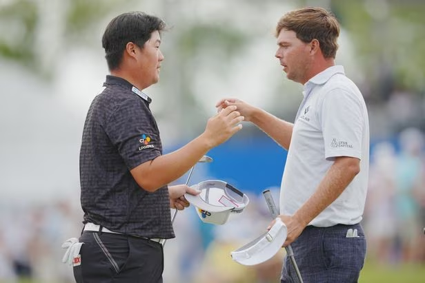 PGA투어 취리히 클래식에서 6위로 대회를 마친 임성재와 키스 미첼(미국)이 악수를 나누고 있다. /USA TODAY Sports